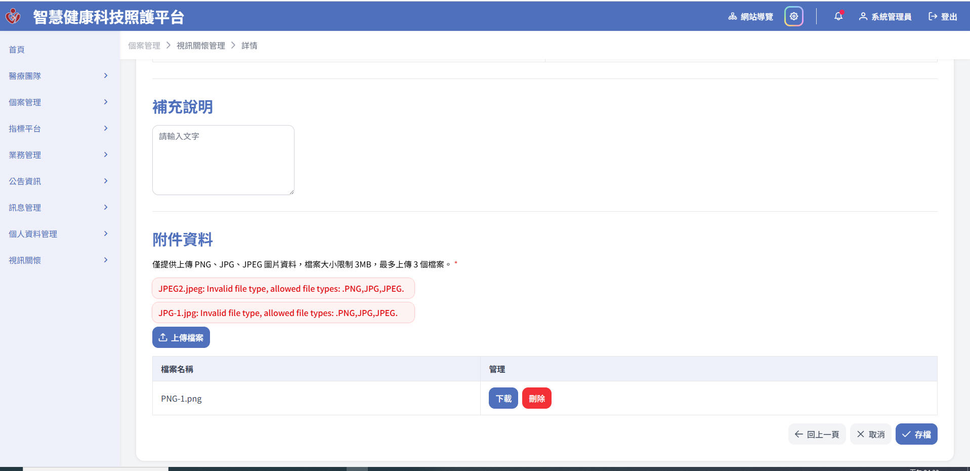 F611個案管理-個管師-視訊關懷管理-詳情附件附件資料(只能上傳 PNGJPG 及 JPEG錯誤)